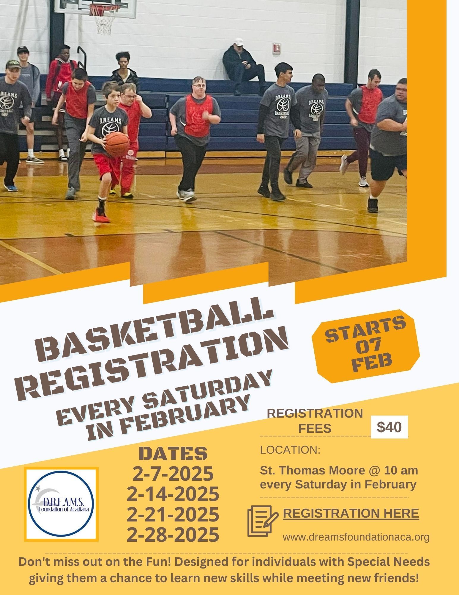 D.R.E.A.M.S Basketball is held in the St. Thomas Moore High School Girl Gym. The basketball season starts Usually in February from 10:00-11:00am on Saturdays. The DREAMS Basketball season consists of 4 games. (all games are in February)